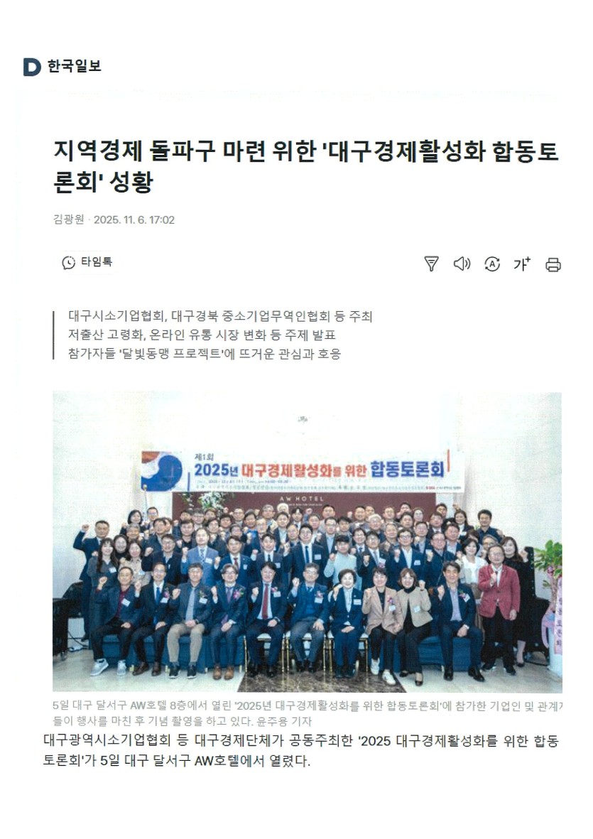 대구광역시소기업협회 등 대구경제단체가 공동주최한 '2025 대구경제활성화를 위한 합동토론회'가 5일 대구 달서구 AW호텔에서 열렸다.